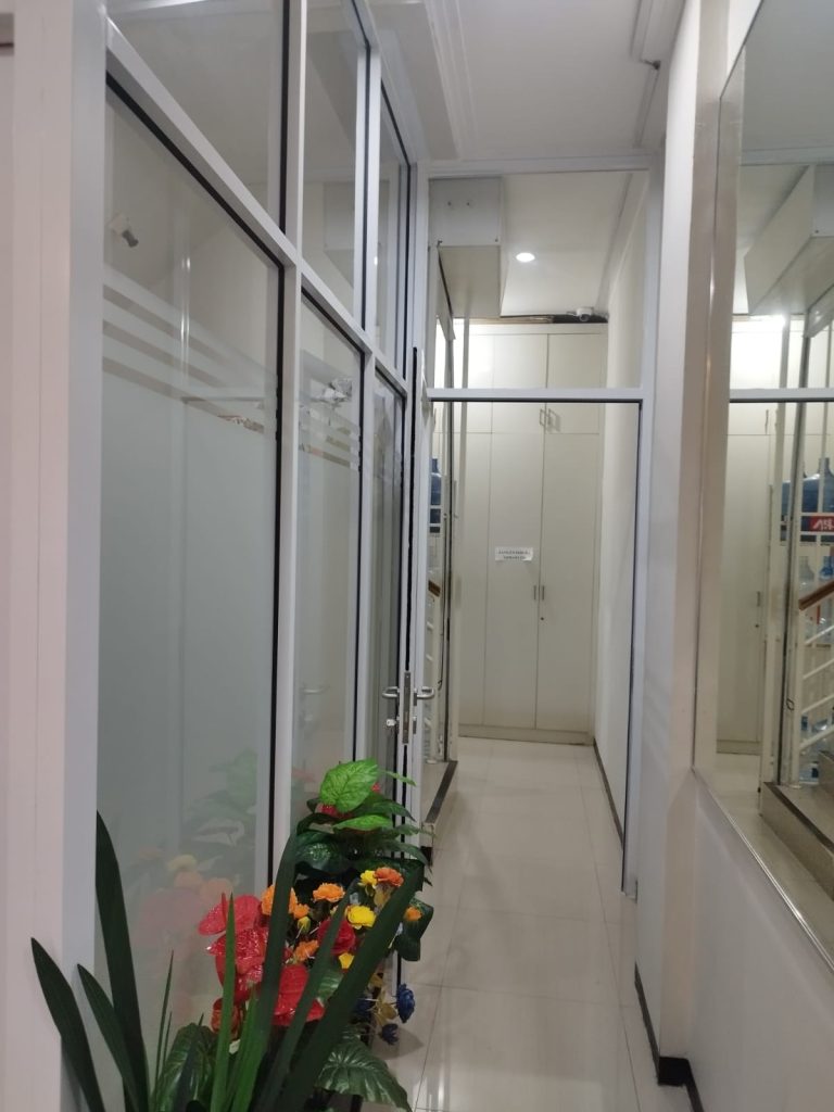 - ada selat ruang dari kaca, ada kaca cermin, lantai granit tile.